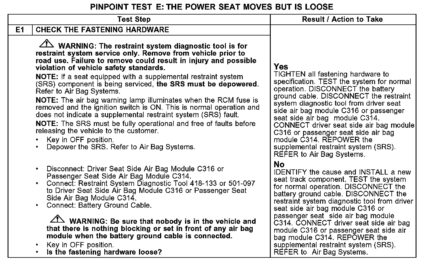 PINPOINT TEST E: THE POWER SEAT MOVES BUT IS LOOSE
