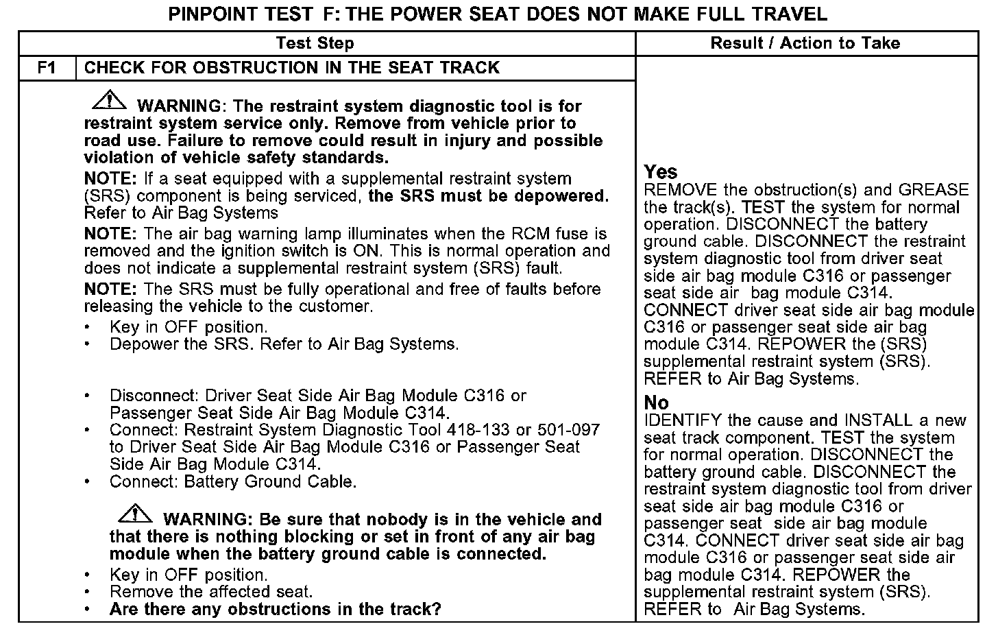 PINPOINT TEST F: THE POWER SEAT DOES NOT MAKE FULL TRAVELF1: