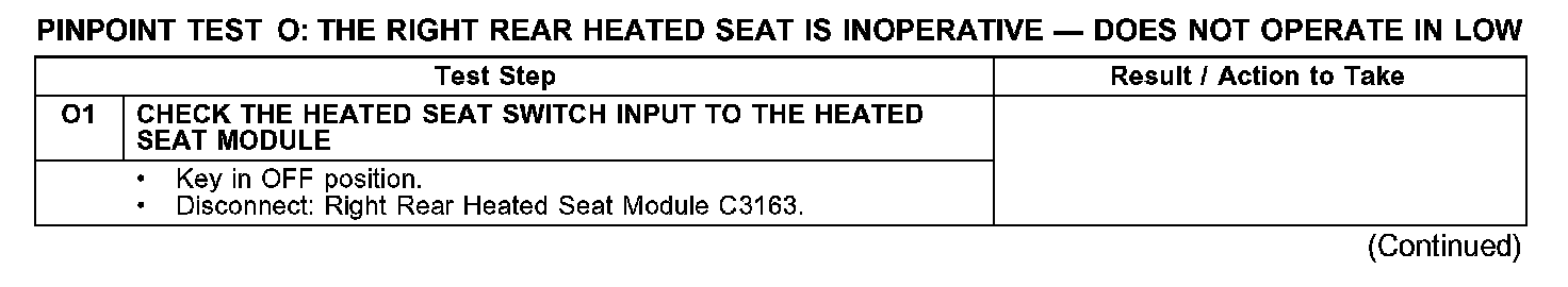PINPOINT TEST O: THE RIGHT REAR HEATED SEAT IS INOPERATIVE - DOES NOT OPERATE IN LOWO1: