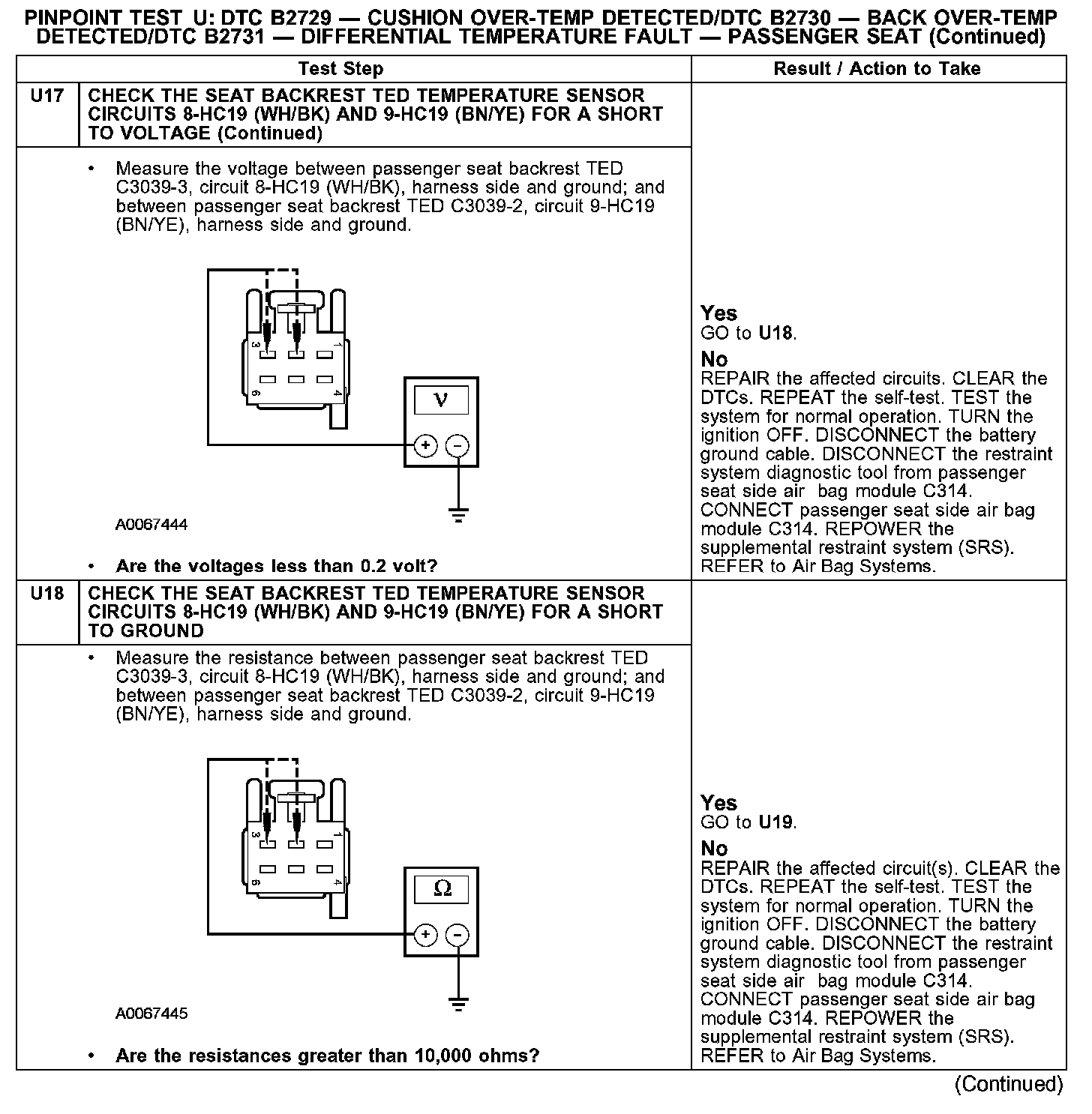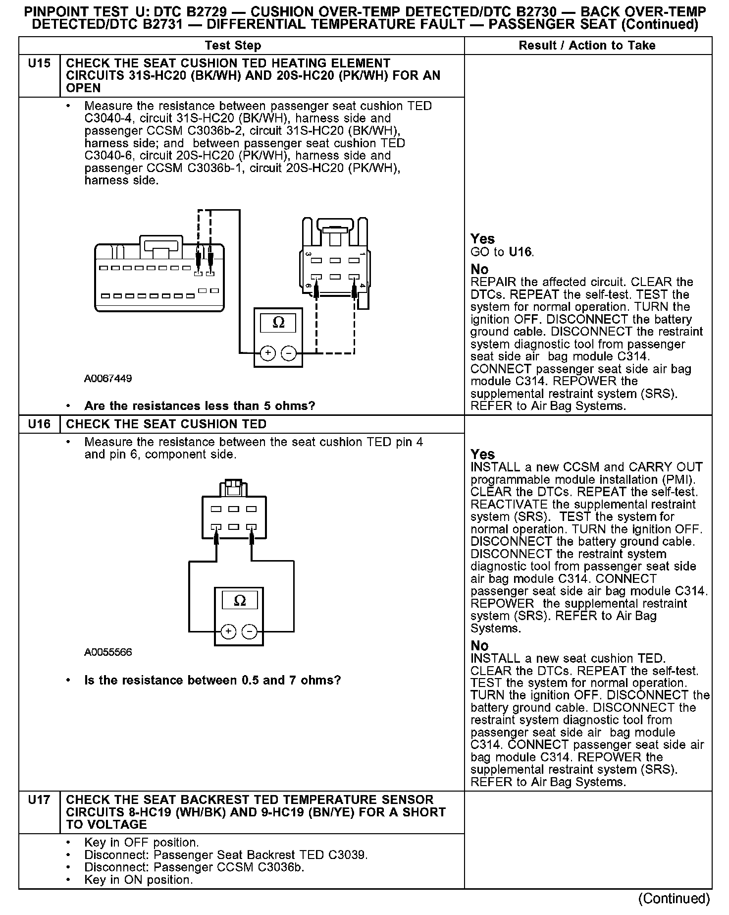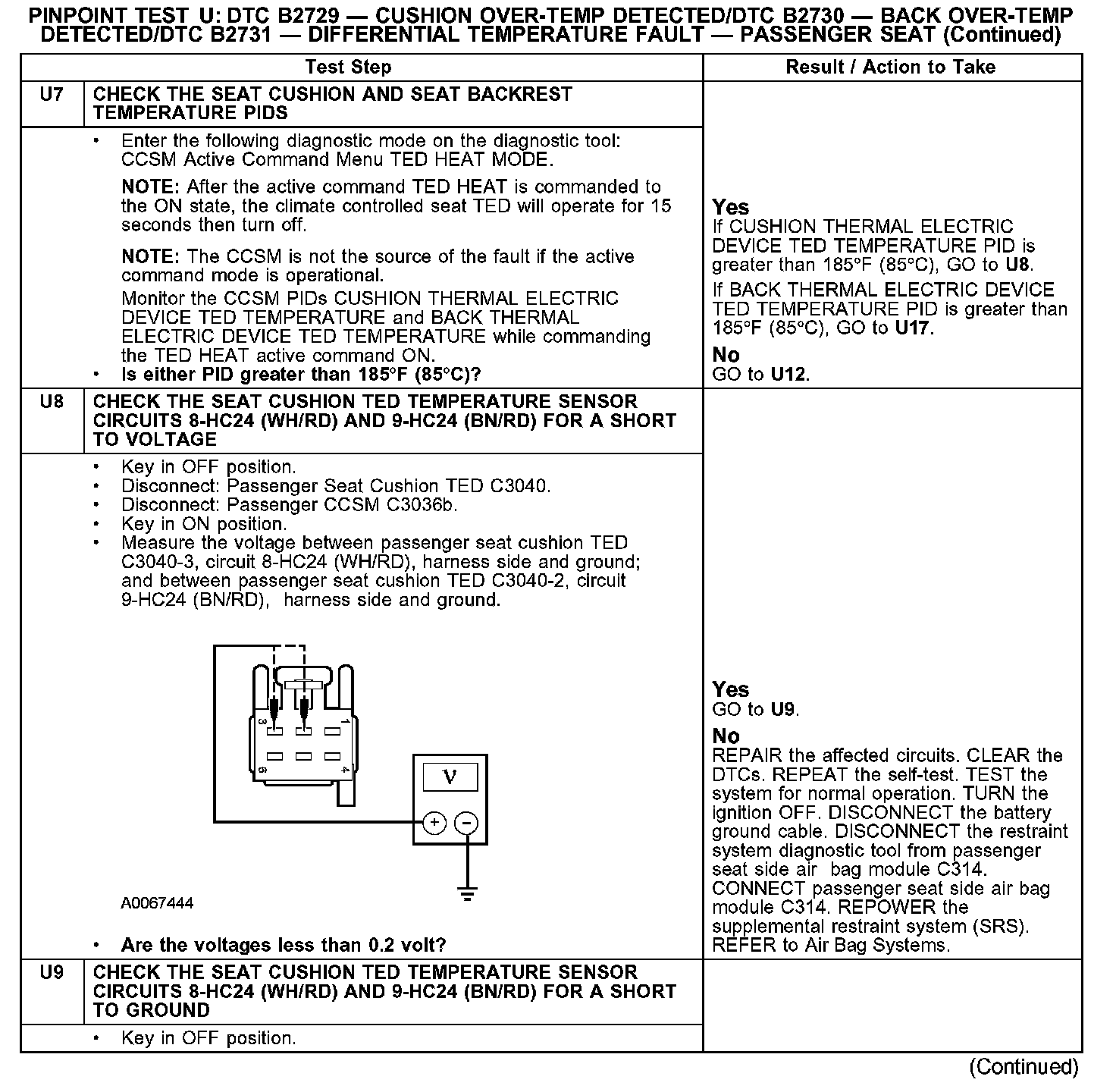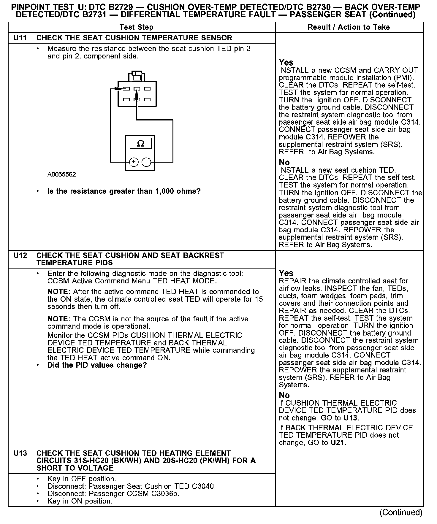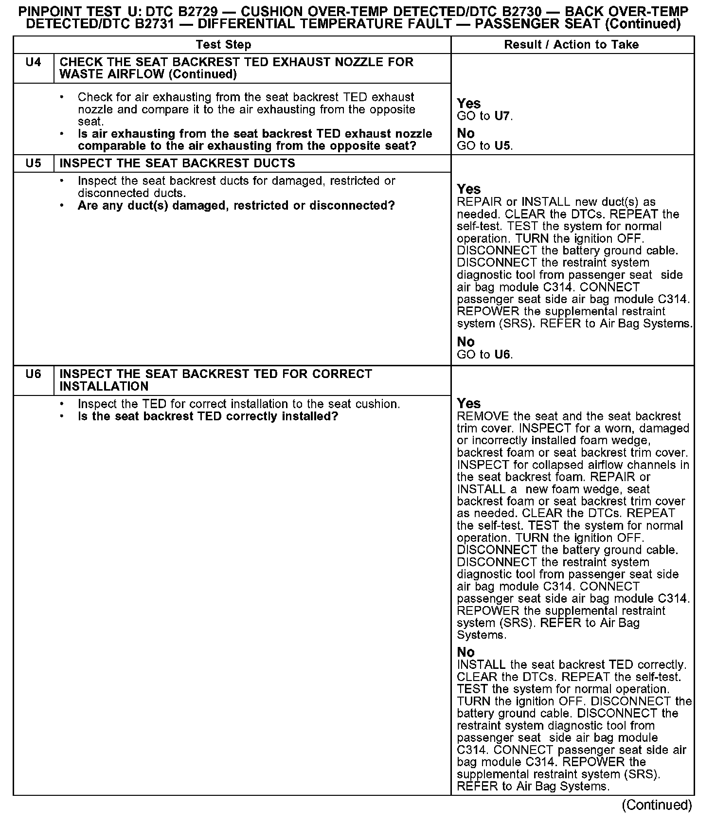 PINPOINT TEST U: DTC B2729 - CUSHION OVER-TEMP DETECTED/DTC B2730 - BACK OVER-TEMP DETECTED/DTC B2731 - DIFFERENTIAL TEMPERATURE FAULT - PASSENGER SEATU1: