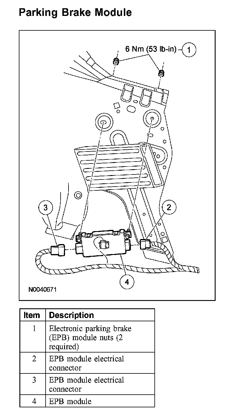 NOTE: If installing a new EPB module, the module must be configured. Follow the diagnostic tool instructions for configuring the EPB module. For additional information, refer to Body Control Systems.