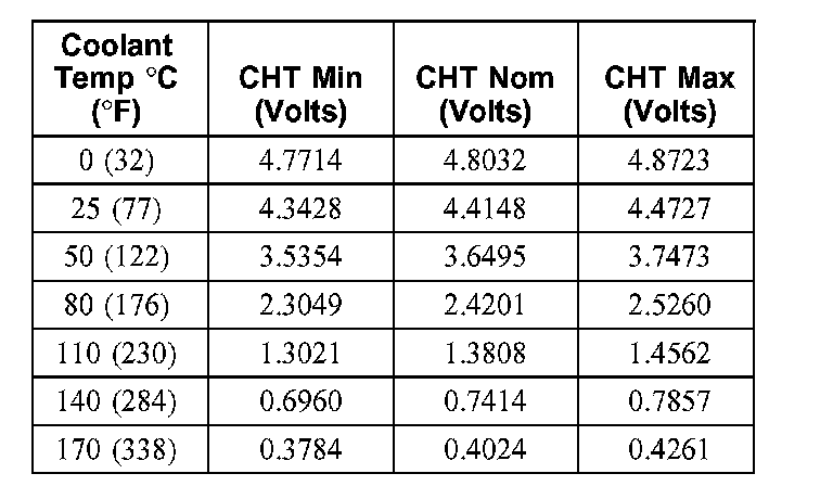 4. Start the engine and allow the engine to idle throughout this test. Allow the engine to run for 2 minutes, then record the CHT voltage. Record the CHT voltage every 60 seconds. When the CHT voltage trend changes direction or only changes slightly (0.03 volt or less) from the previous reading, record this as the thermostat opening voltage. Use the voltage and corresponding coolant temperature chart.