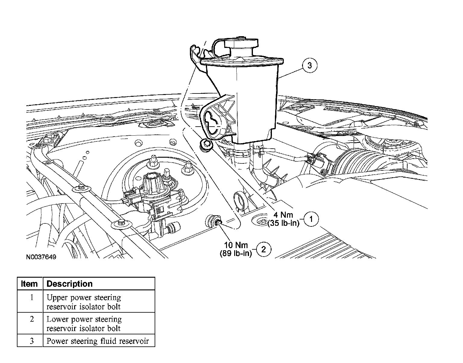 1. Loosen the upper power steering fluid reservoir isolator bolt.