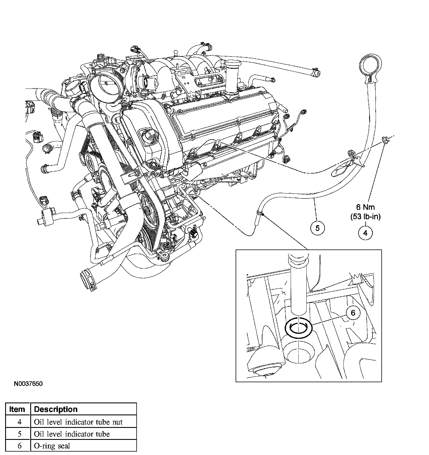 5. CAUTION: Failure to lubricate the O-ring seal and the oil level indicator tube-to-engine block mating surface with clean engine oil can result in engine oil leaks.