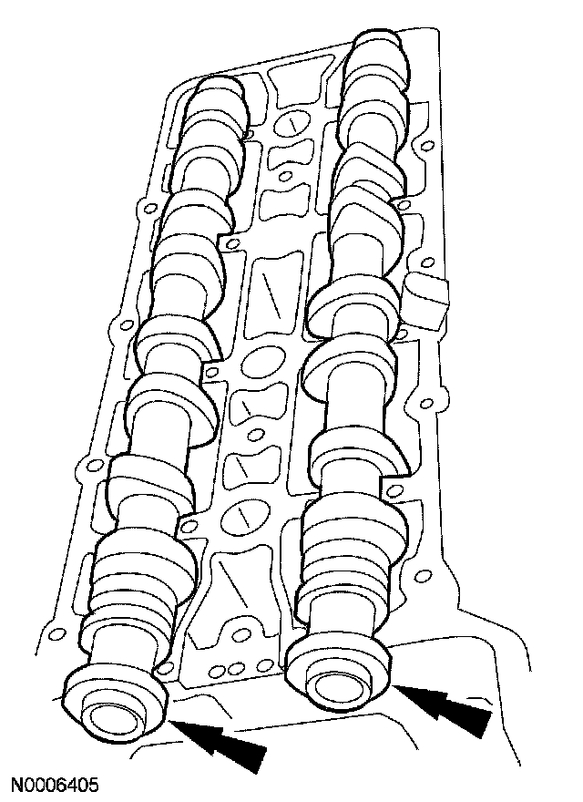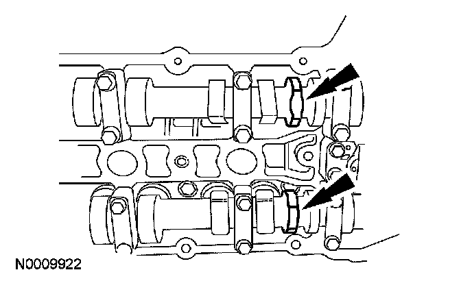 38. CAUTION: The flats on the camshaft must completely contact the special service tool or damage to the camshafts can occur. Slowly draw the special tool down evenly until it is fully seated on the camshaft flats.