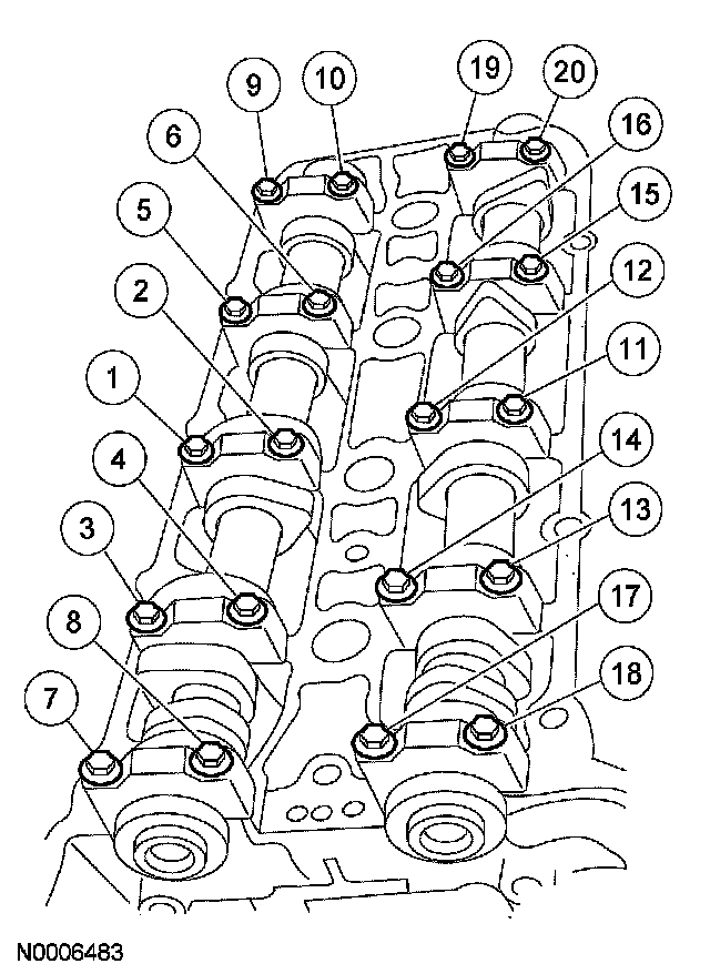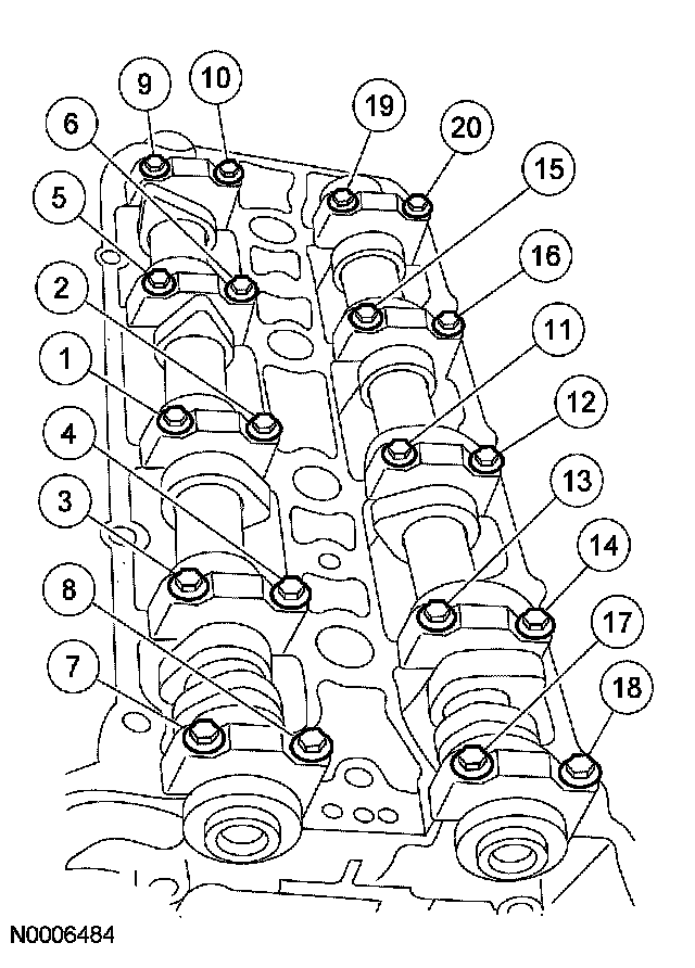 12. CAUTION: Install the camshaft bearing caps. The camshaft bearing caps are positional and must be installed in their original locations and orientation or engine damage can occur.