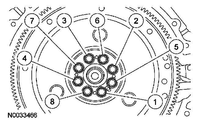 18. Install the flexplate and tighten the bolts in 2 stages in the sequence shown.