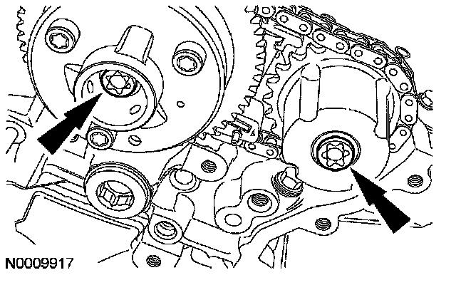 CAUTION: Using the special tool, apply 10 Nm (89 inch lbs.) counterclockwise to the LH exhaust camshaft sprocket.