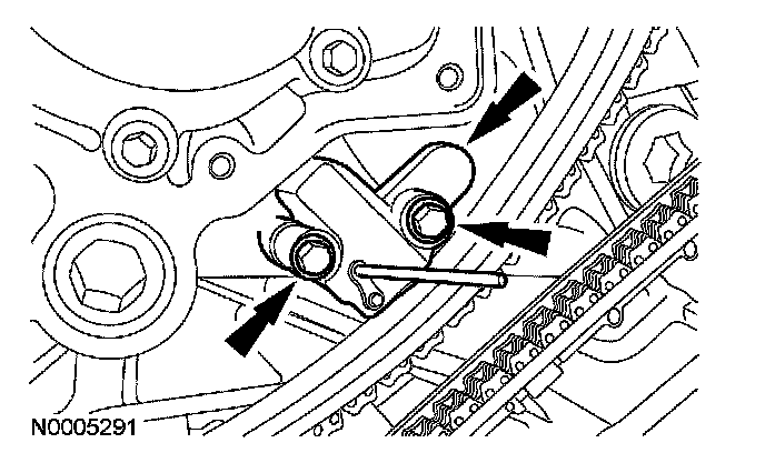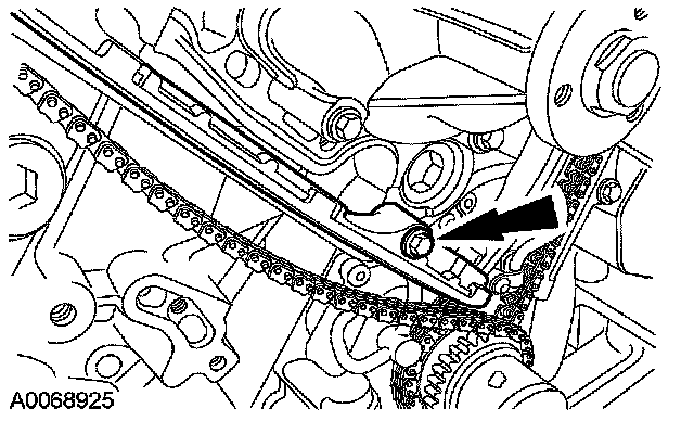 35. Install the LH timing chain tensioner. Install the timing chain tensioner and bolts, and remove the drill rod.