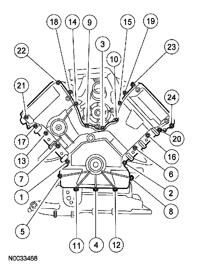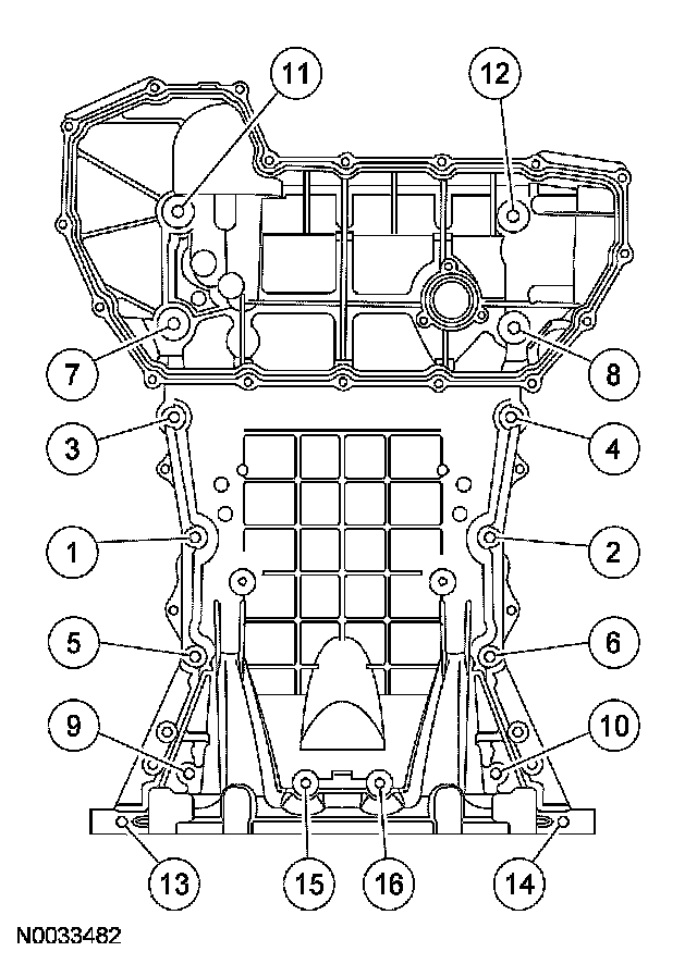 48. Install the oil sump. Using a straightedge, align the sump to the lower cylinder block. Tighten the bolts in sequence in 2 stages.