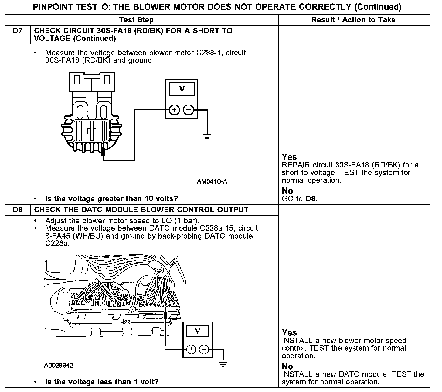 Under normal operation, the blower motor relay coil receives a ground from the DATC module through circuit 31S-FA23 (BK/BU). The coil receives voltage through circuit 30-FA24 (RD/OG). Voltage is supplied to the relay contacts from circuit 30-FA24 (RD/OG). When the relay coil is energized, voltage is delivered to the blower motor through circuit 30S-FA18 (RD/BK). Ground for the motor is provided through circuit 31S-FA18 (BK/RD) from the blower control module. Ground for the blower control module is provided by circuit 31-FA45 (BK). The DATC module sends a 0-volt (LO) to 5-volt (HI) signal to the blower control module through circuit 8-FA45 (WH/BU) to control the blower speed.