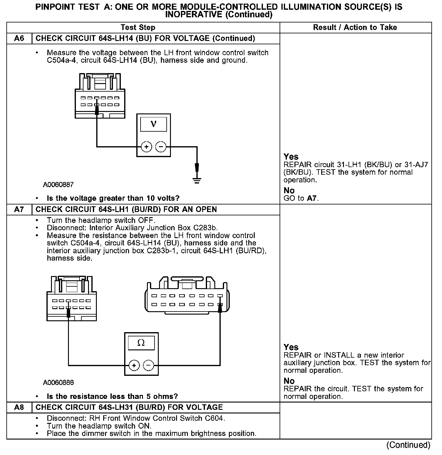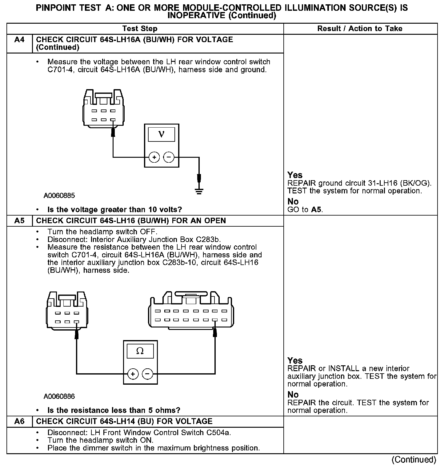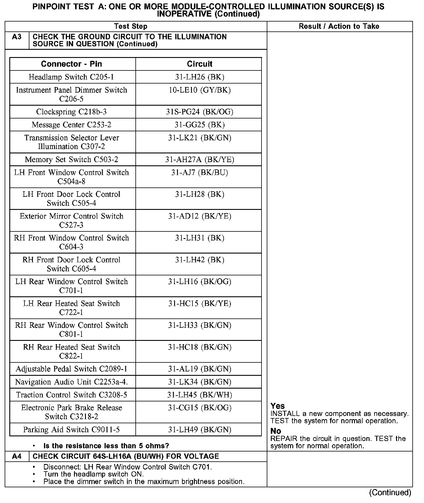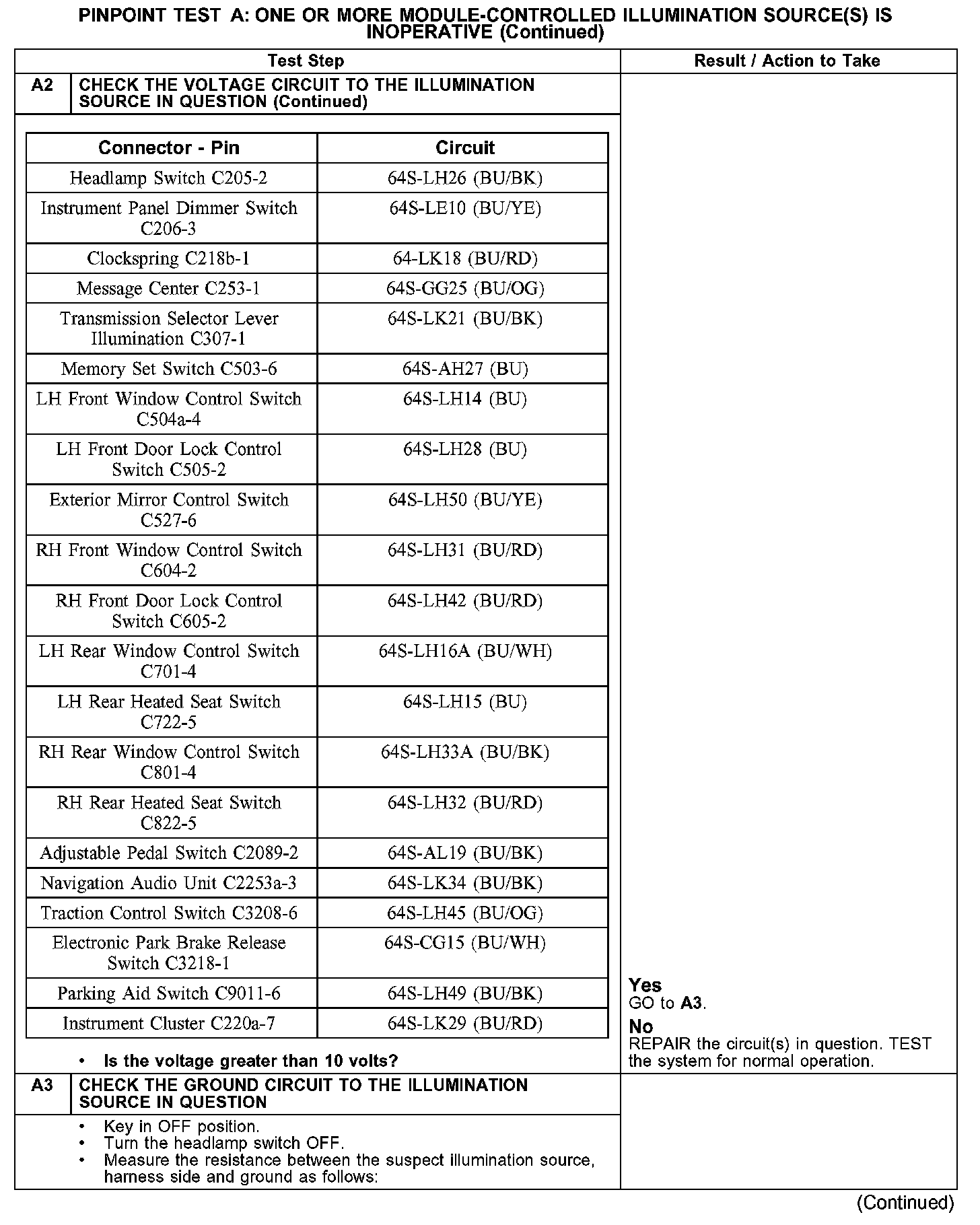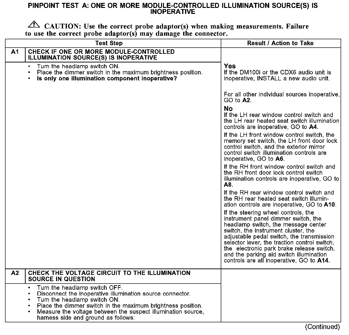 PINPOINT TEST A: ONE OR MORE MODULE-CONTROLLED ILLUMINATION SOURCE(S) IS INOPERATIVEA1-A2:
