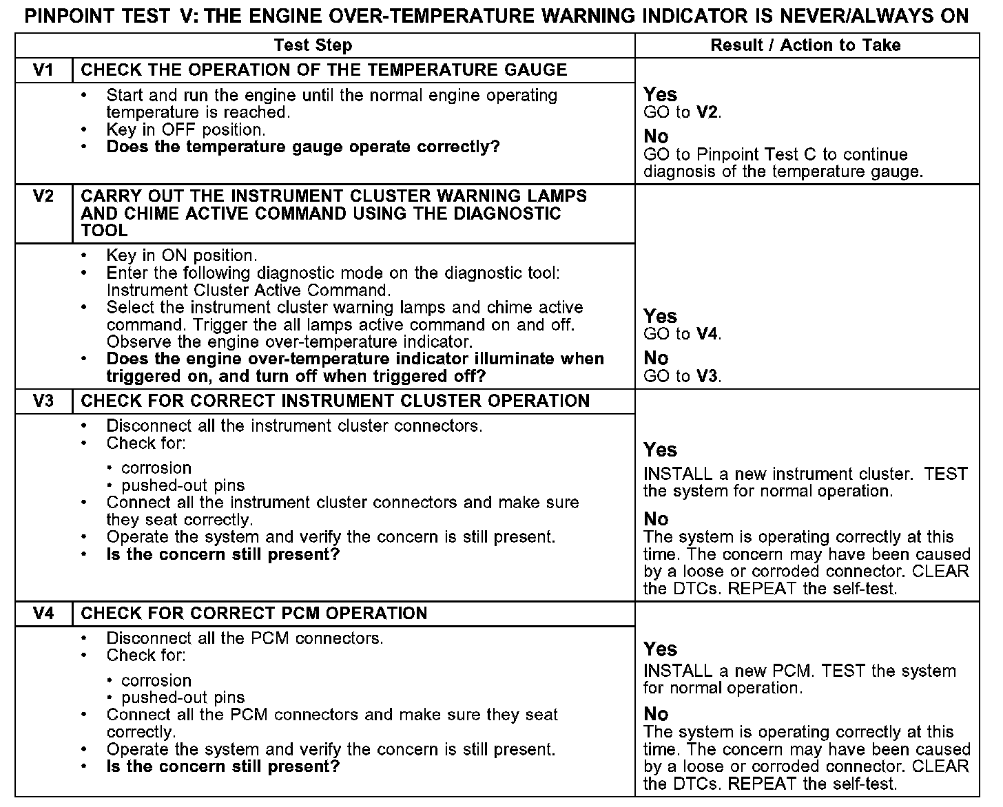 PINPOINT TEST V: THE ENGINE OVER-TEMPERATURE WARNING INDICATOR IS NEVER/ALWAYS ONV1-V4: