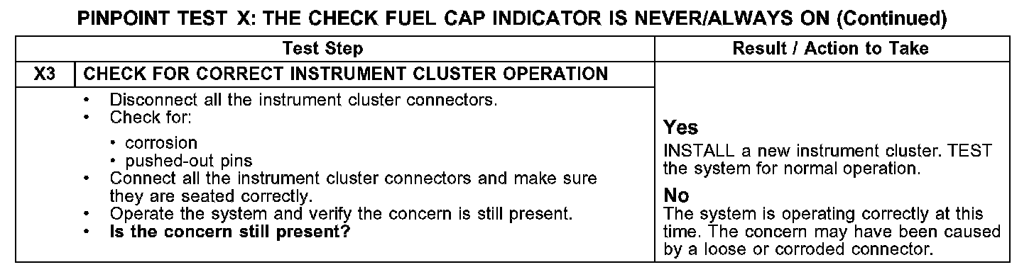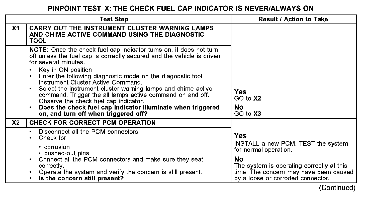 PINPOINT TEST X: THE CHECK FUEL CAP INDICATOR IS NEVER/ALWAYS ONX1-X2: