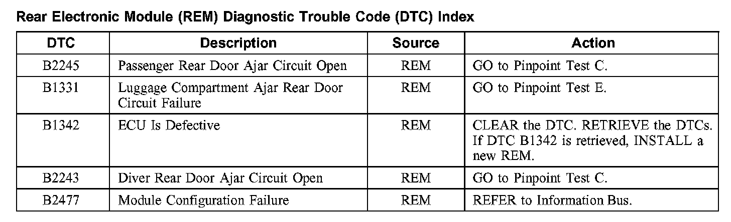 Rear Electronic Module (REM) Diagnostic Trouble Code (DTC) Index