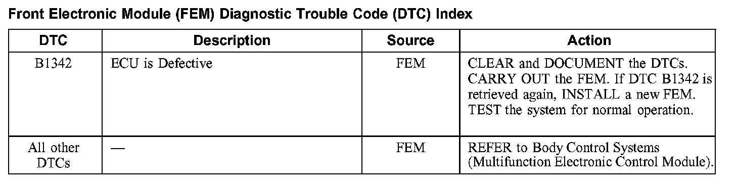 Front Electronic Module (FEM) Diagnostic Trouble Code (DTC) Index