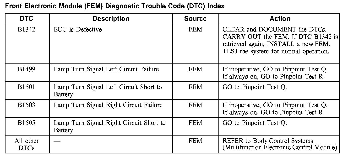 Front Electronic Module (FEM) Diagnostic Trouble Code (DTC) Index