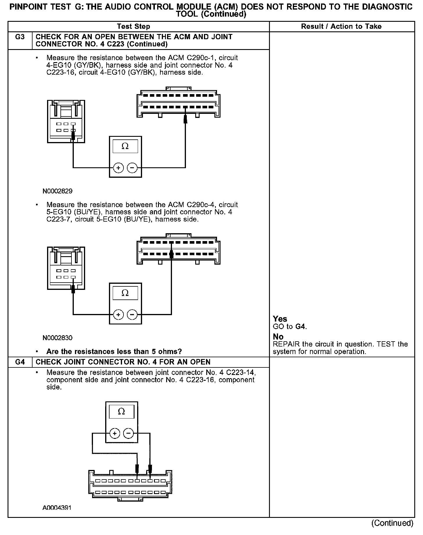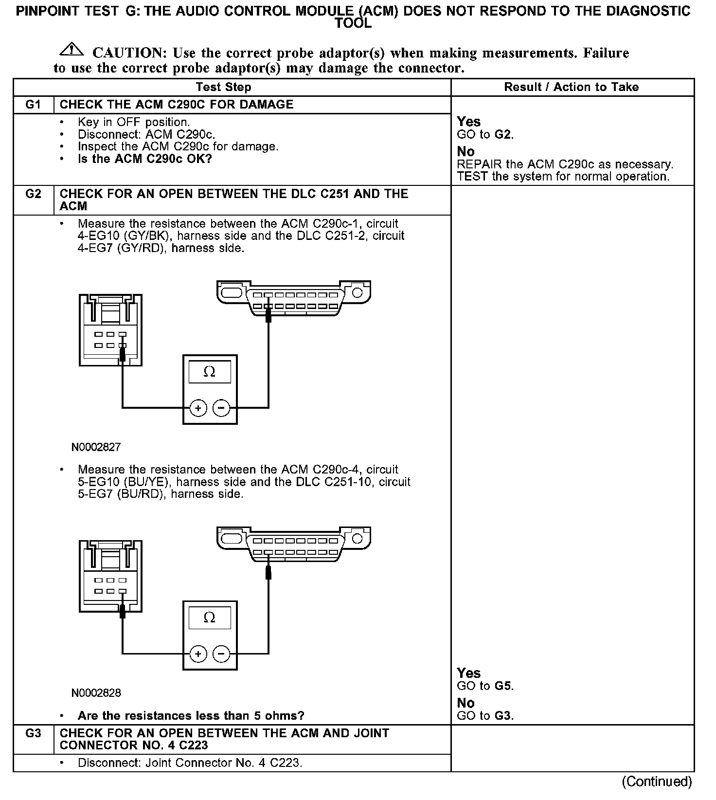 The ACM module communicates with the diagnostic tool through the standard corporate protocol (SCP) communications network circuits 4-EG10 (GY/BK) and 5-EG10 (BU/YE). If one of the SCP communications network circuits becomes shorted to ground or voltage, or if some but not all termination resistors are lost, communications can continue. Check circuits 4-EG10 (GY/BK) and 5-EG10 (BU/YE) between the ACM C290c and the data link connector (DLC) C251. The total resistance values must not be more than 5 ohms. If the resistance is more than 5 ohms, there is either an open in circuits 4-EG10 (GY/BK) and 5-EG10 (BU/YE), damage to the DLC C251, the ACM C290c, or joint connector No. 4 C223.