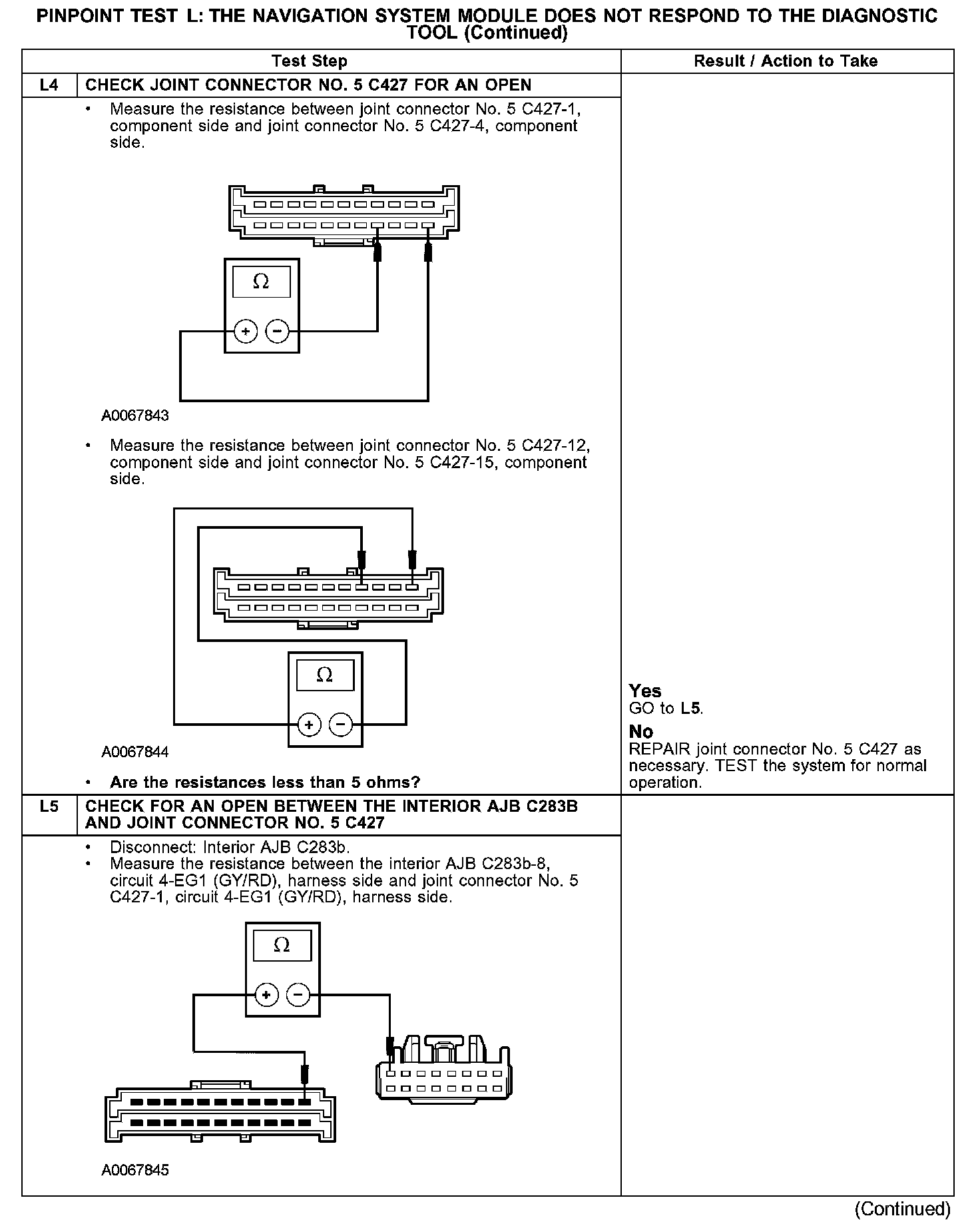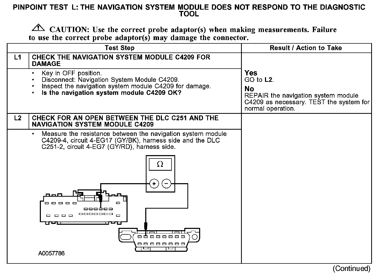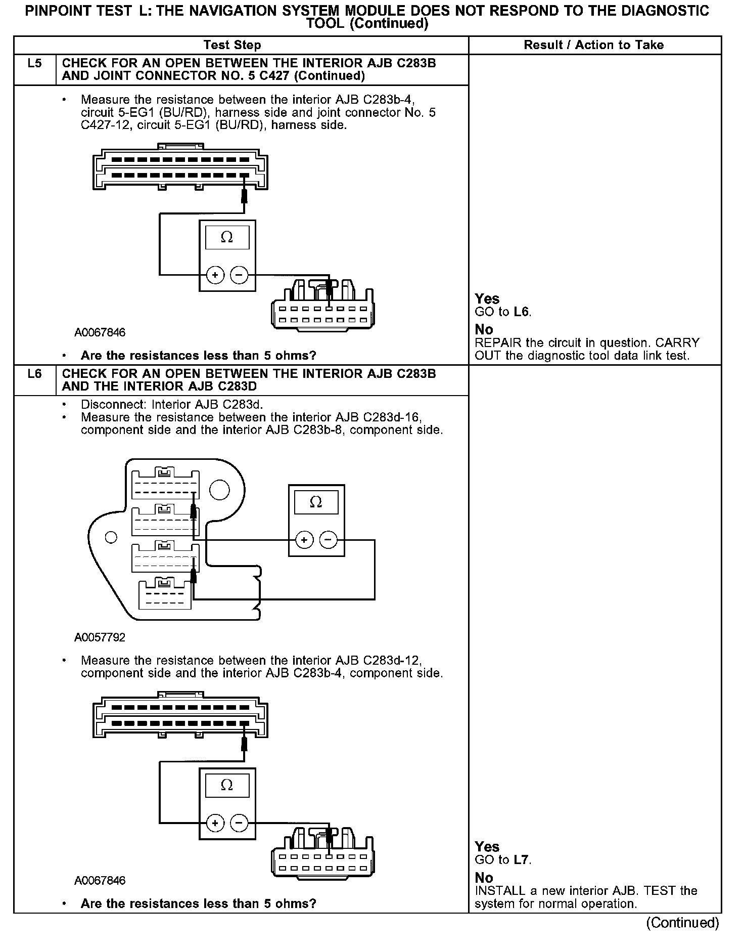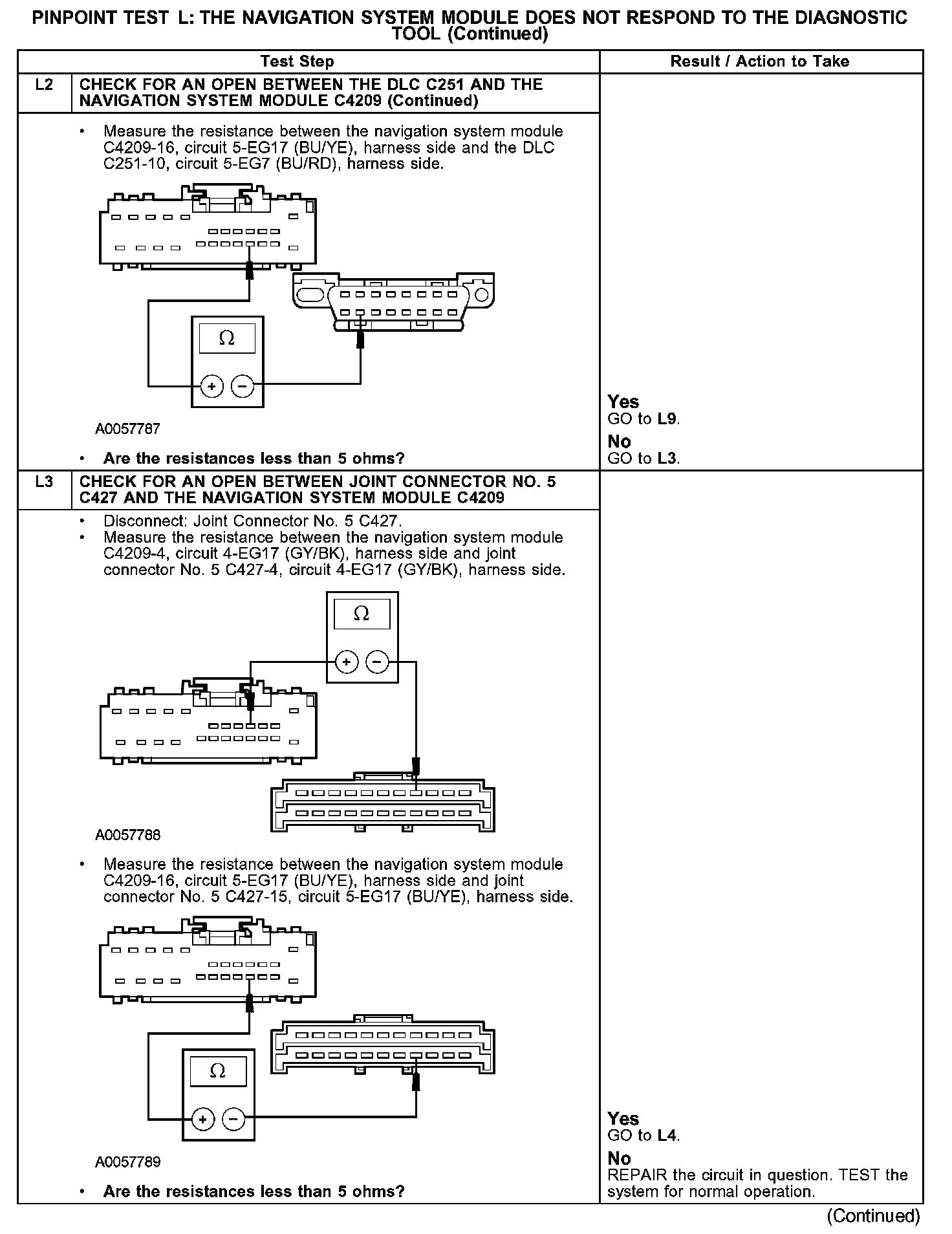 The navigation system module communicates with the diagnostic tool through the standard corporate protocol (SCP) communications network circuits 4-EG17 (GY/BK) and 5-EG17 (BU/YE). If one of the SCP communications network become shorted to ground or voltage, or if some but not all termination resistors are lost, communications can continue. Check circuits 4-EG17 (GY/BK) and 5-EG17 (BU/YE) between the navigation system module C4209 and the data link connector (DLC) C251. The total resistance values must not be more than 5 ohms. If the resistance is more than 5 ohms, there is either an open in circuit 4-EG17 (GY/BK) and 5-EG17 (BU/YE), damage to the DLC C251, damage to the navigation system module C4209, or a problem in the interior auxiliary junction box (AJB) C283b, interior AJB C283d, joint connector No. 4 C223 or joint connector No. 5 C427.