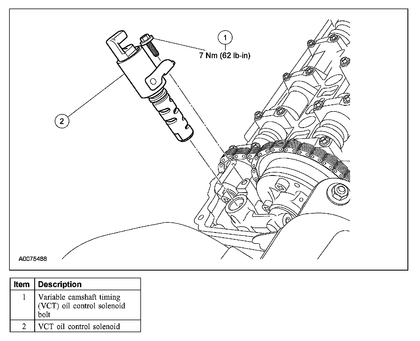 2. Remove the bolt and the variable camshaft timing (VCT) oil control solenoid.