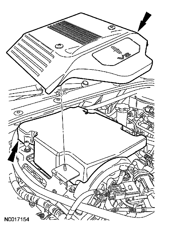 2. CAUTION: The engine appearance cover is equipped with a noise suppressor. If the noise suppressor becomes separated from the engine appearance cover it must be positioned on the intake manifold prior to installing the engine appearance cover.