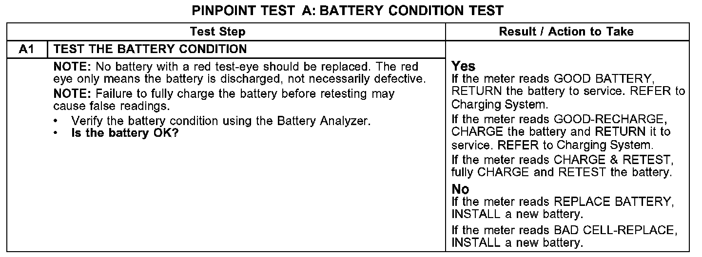 PINPOINT TEST A: BATTERY CONDITION TEST