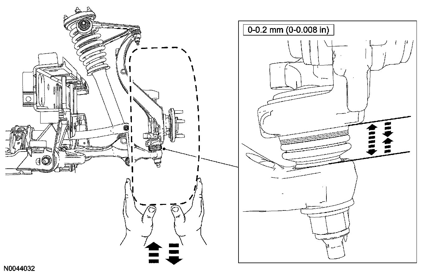 Inspect the ball Joint for relative movement by alternately pulling downward and pushing upward on the upper control arm by hand. Note any relative vertical movement between the wheel knuckle and upper arm at the upper ball joint.