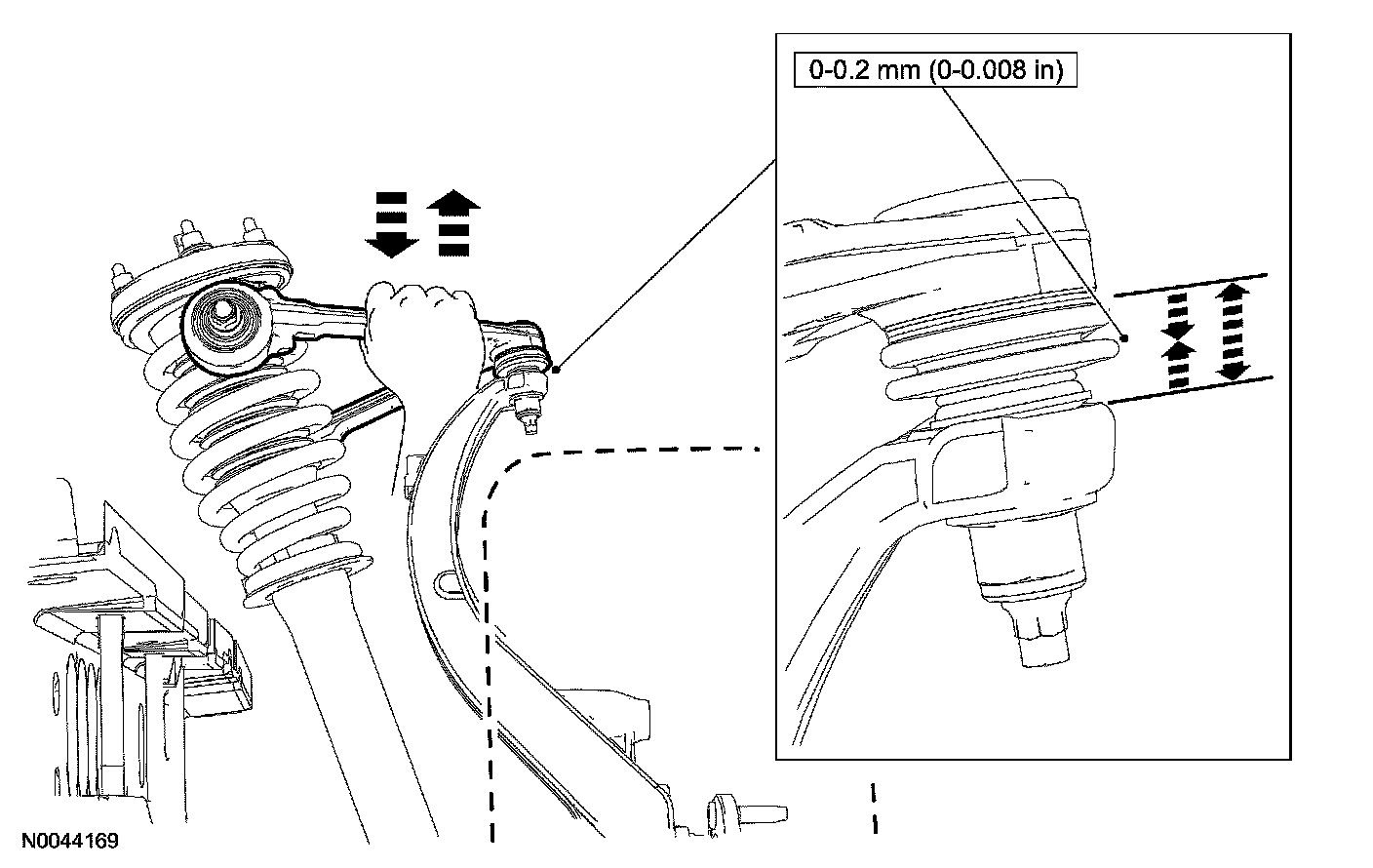 9. Measure the ball joint deflection, while an assistant pushes up and then pulls down on the upper control arm, by hand.