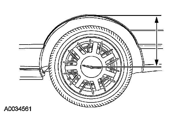 1. For reference during the installation of an upper or lower arm, measure the distance between the center of the wheel hub and the lip of the fender with the weight of the vehicle resting on the wheel and tire assemblies.