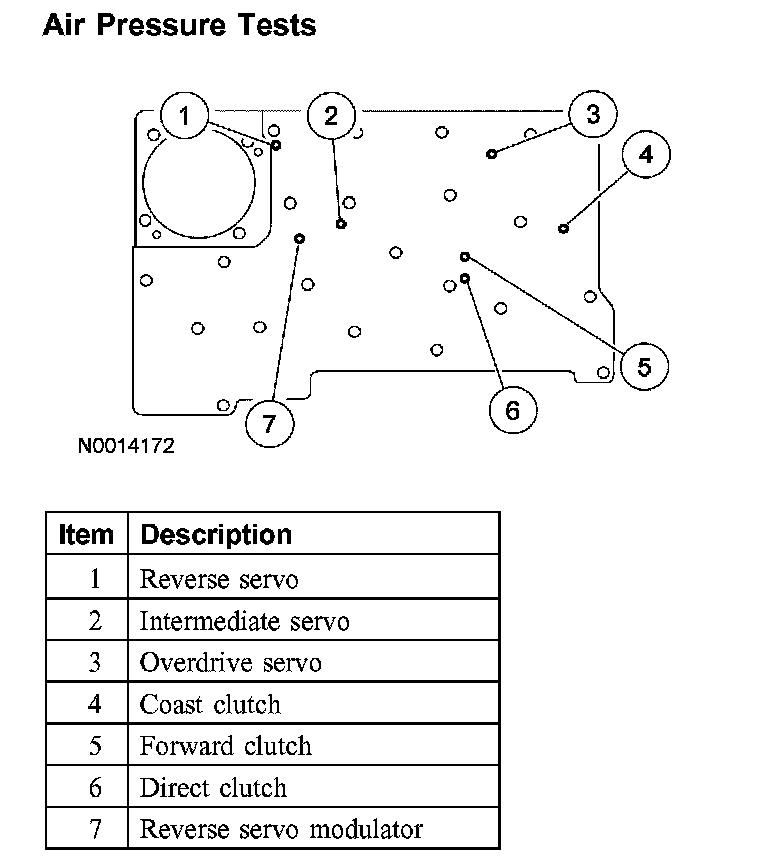 Apply air to the appropriate clutch or servo port (refer to plate layout diagram). Refer to the Air Pressure Test Diagnostic Chart for conditions, possible causes and actions.