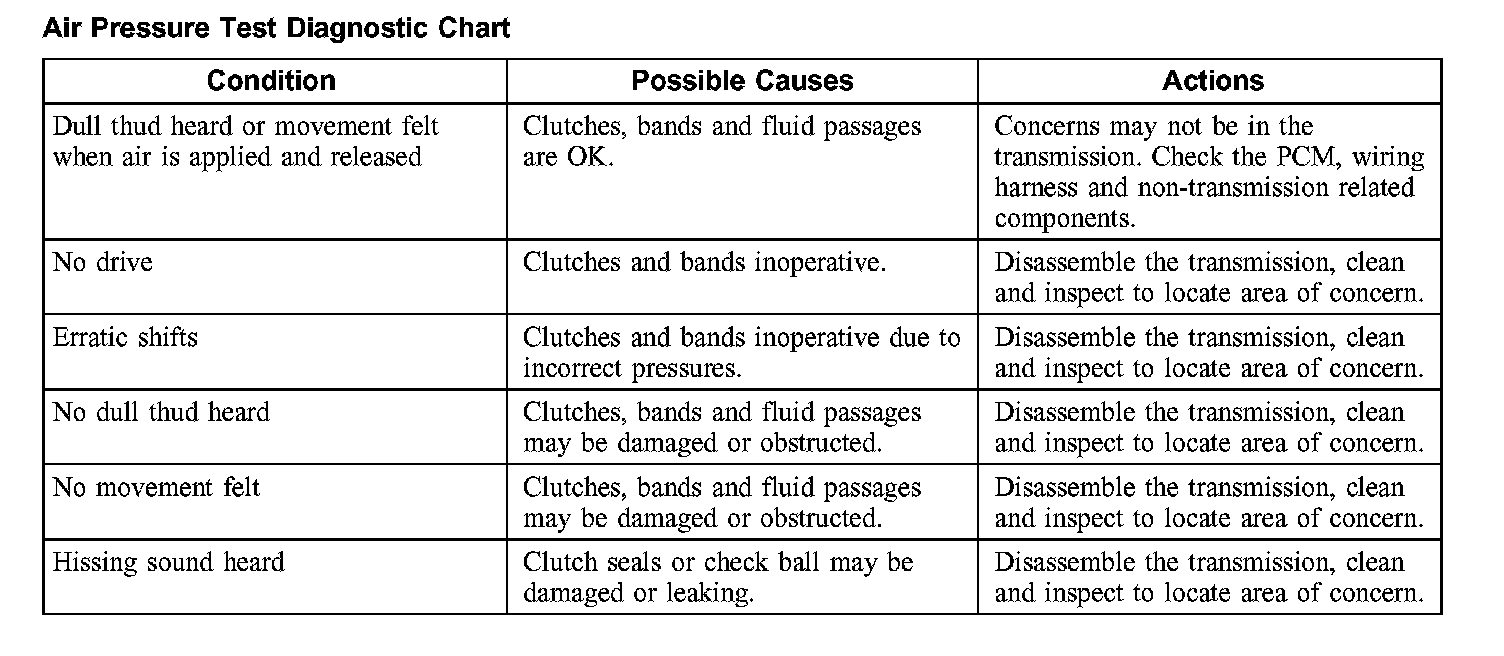 Air Pressure TestsA no-drive or erratic shift condition may be due to inoperative bands and clutches. To diagnose these conditions, a series of checks can be made by substituting air pressure for fluid to determine the location of the damaged or obstructed component.
