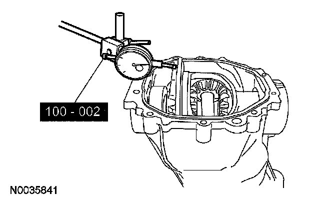 ^ Turn the differential ring gear without turning the differential pinion gear. Record the indicator reading. The allowable backlash is 0.127 mm (0.005 inch) to 0.228 mm (0.009 inch) and must not vary more than 0.076 mm (0.003 inch) between points measured. A backlash variation of more than 0.076 mm (0.003 inch) between points checked indicates gear/case runout.