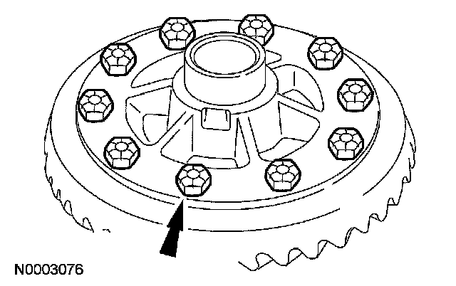 32. Remove the differential ring gear bolts. Apply Stud and Bearing Mount to the differential ring gear bolt threads, and reinstall the differential ring gear bolts.