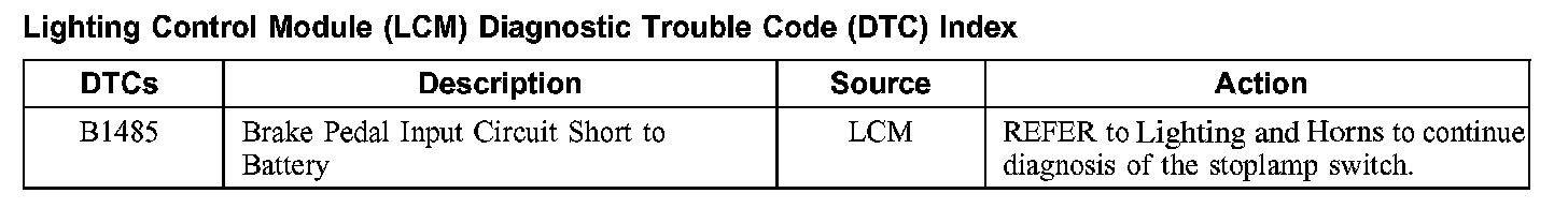 Lighting Control Module (LCM) Diagnostic Trouble Code (DTC) Index