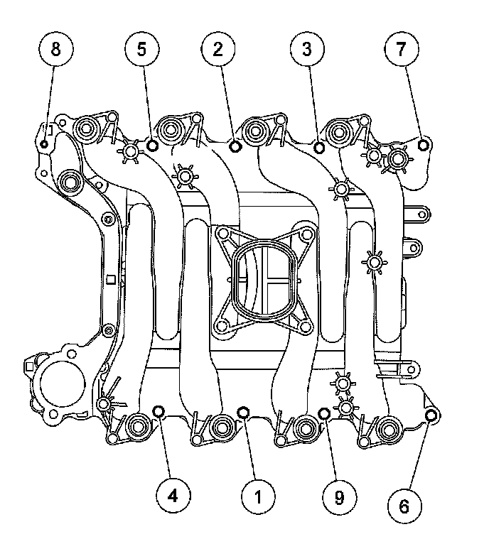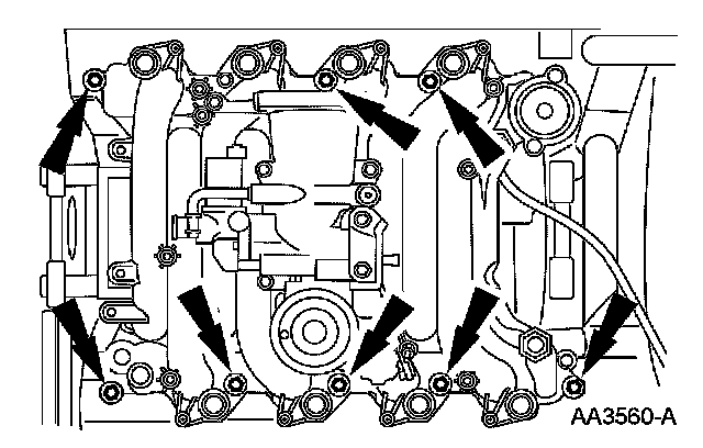 56. Install the intake manifold and hand-tighten the bolts at the locations shown.