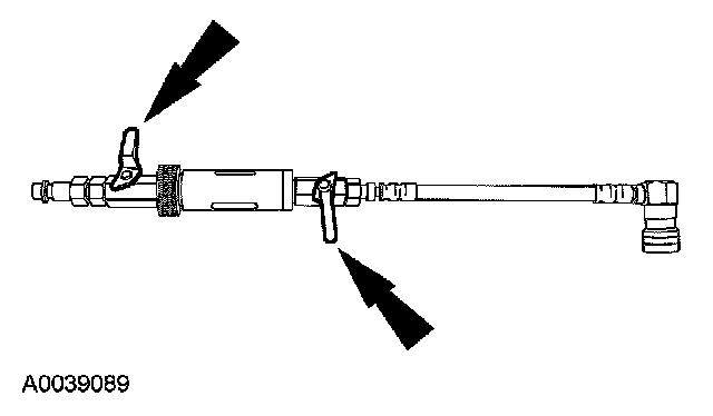 5. Install the dye/lubricant injector between the low-side service gauge port valve and the refrigerant service station or manifold gauge set.