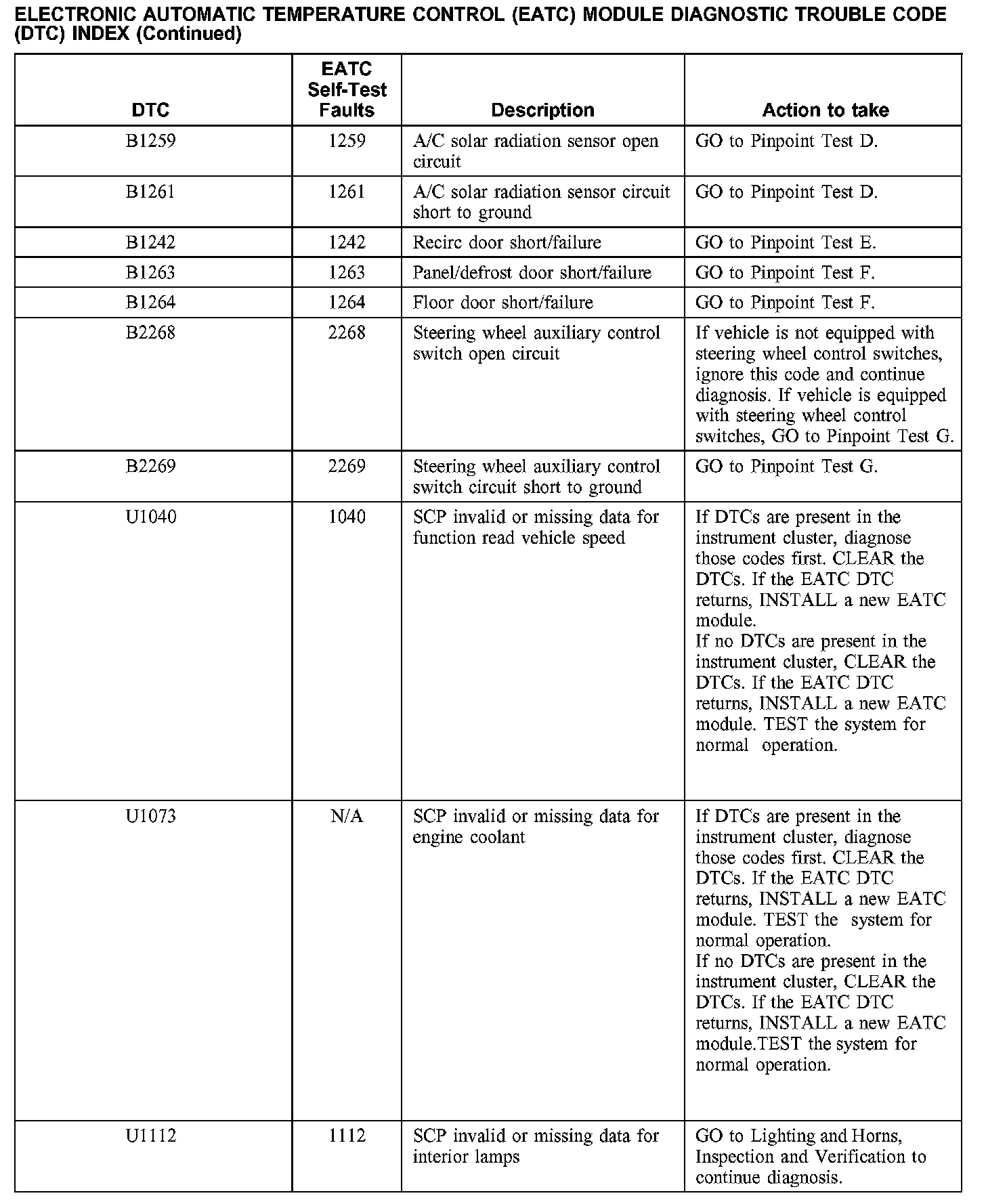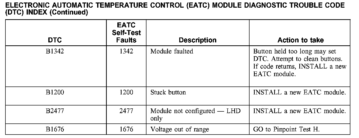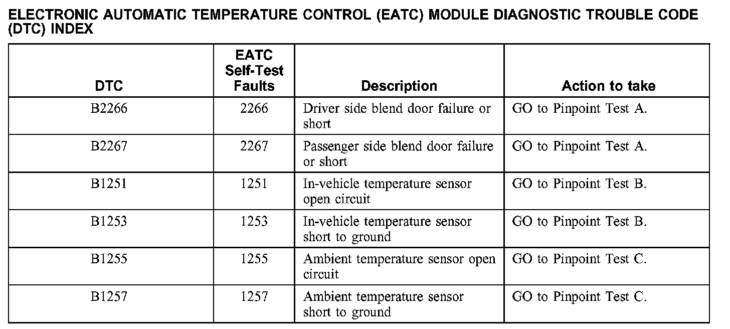 Electronic Automatic Temperature Control (EATC) Module Diagnostic Trouble Code DTC) Index