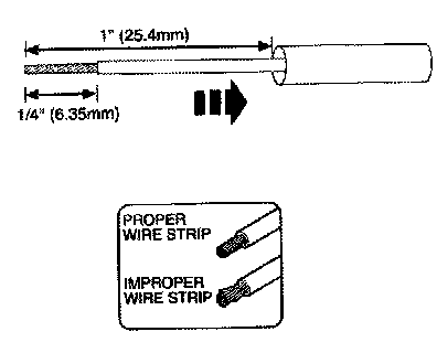 2. Strip 1/4" (6.35mm) of insulation from each wire end, taking care not to nick or cut wire strands.
