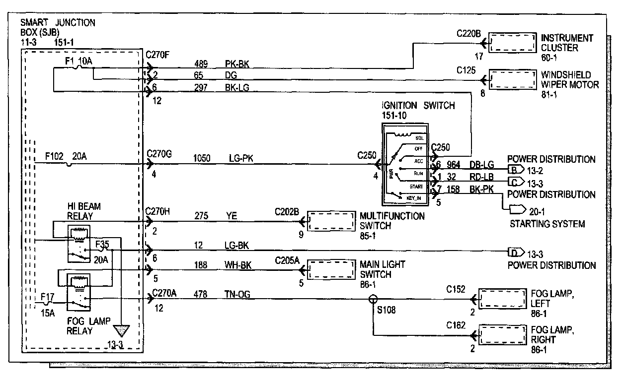Splices directly connecting to the power distribution are best represented on the power distribution diagrams in Power and Distribution Diagrams. Splices connected to grounds can be seen completely in Power and Distribution Diagrams. For all other splices, a reference is given to the diagram where that particular splice can be best viewed.