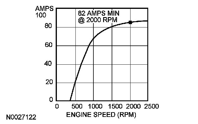 4. With the engine running at approximately 2,000 rpm, adjust the tester load bank to determine the output of the generator. The generator output should be greater than the graph shown. If not, refer to the pinpoint test or GO to Symptom Chart. Pinpoint Tests Symptom Related Diagnostic Procedures