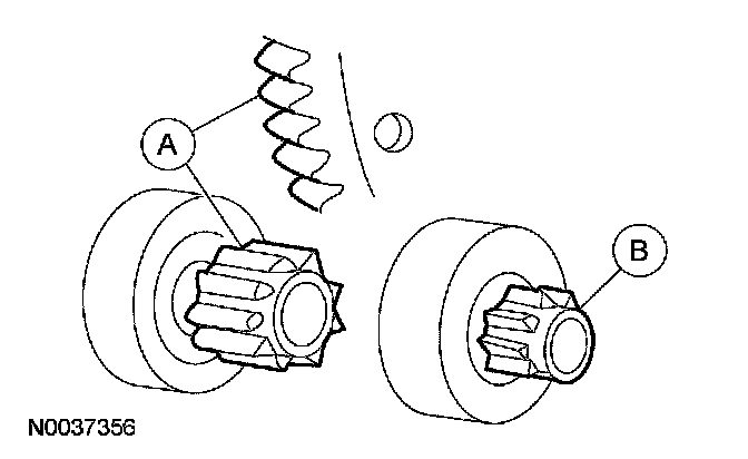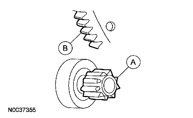 3. If the (A) starter drive gear and the flywheel ring gear are not fully meshing or the gears are (B) milled or damaged, install a new starter motor. Install a new flywheel ring gear.
