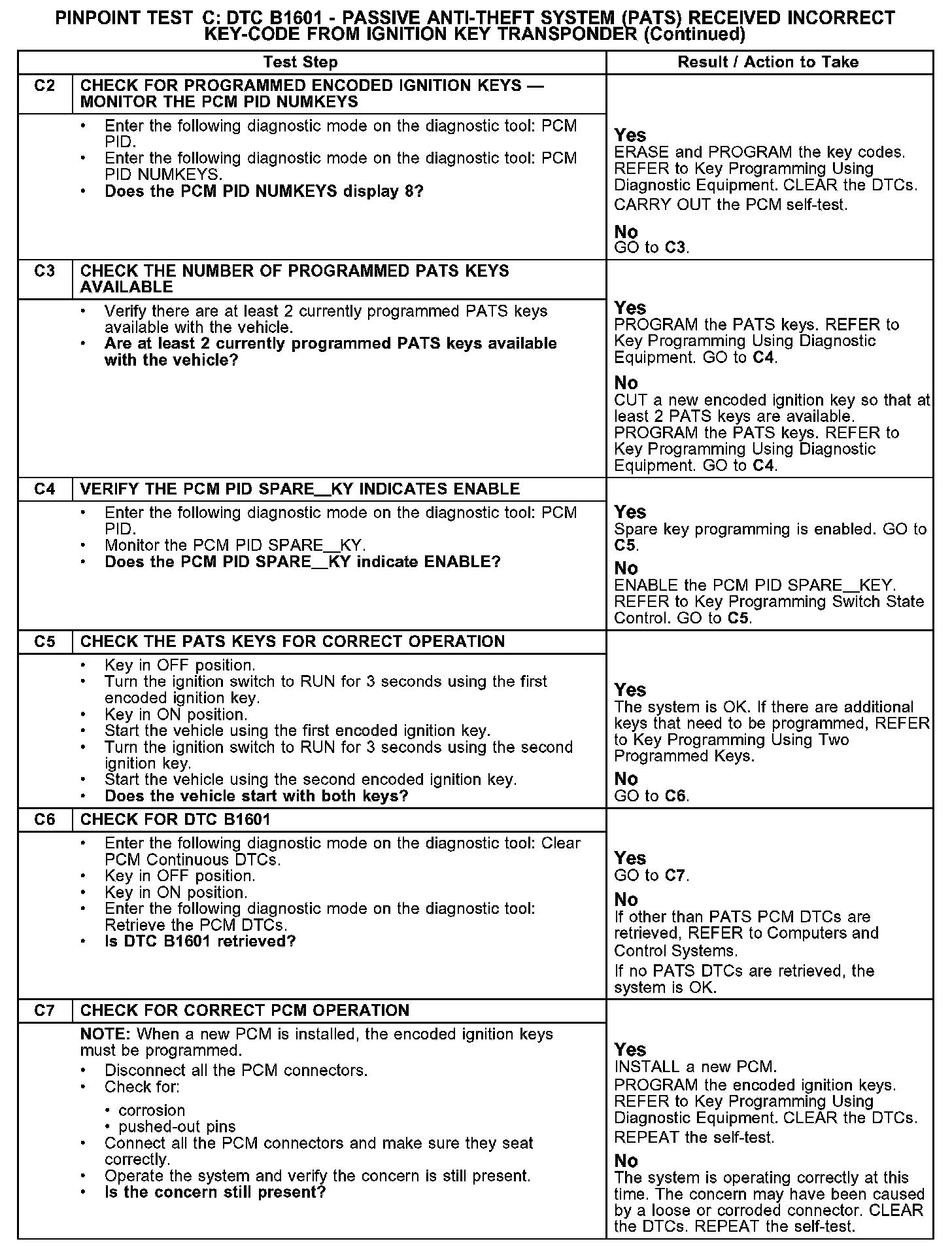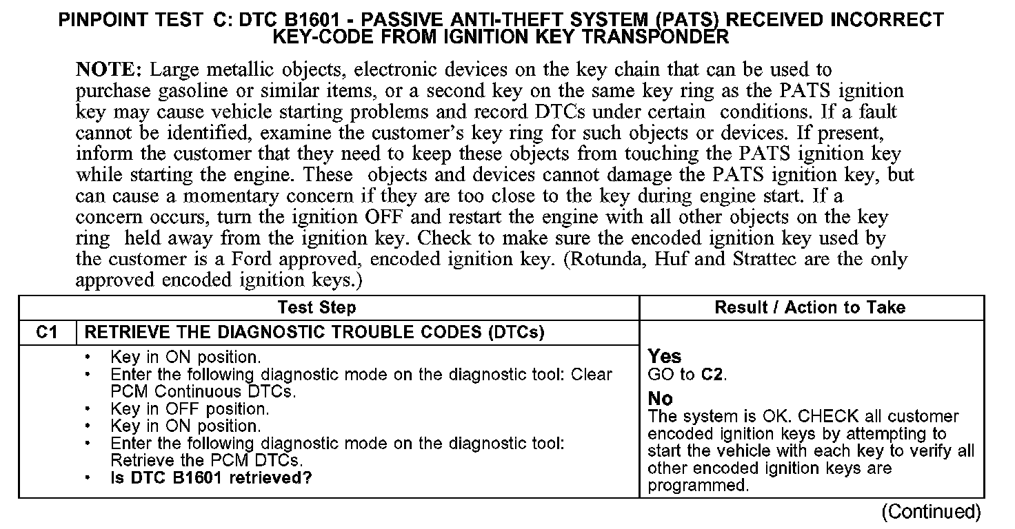 PINPOINT TEST C: DTC B1601 - PASSIVE ANTI-THEFT SYSTEM (PATS) RECEIVED INCORRECT KEY-CODE FROM IGNITION KEY TRANSPONDERC1: