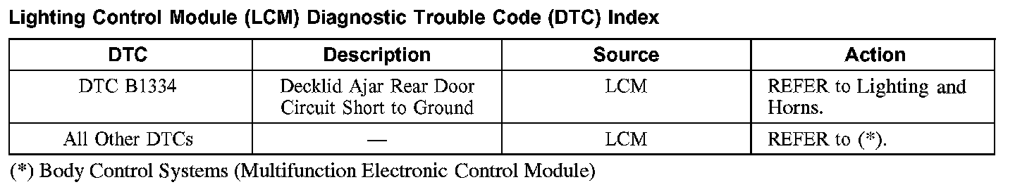 Lighting Control Module (LCM) Diagnostic Trouble Code (DTC) Index
