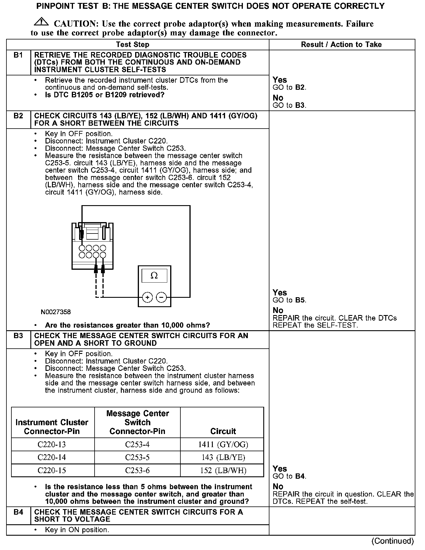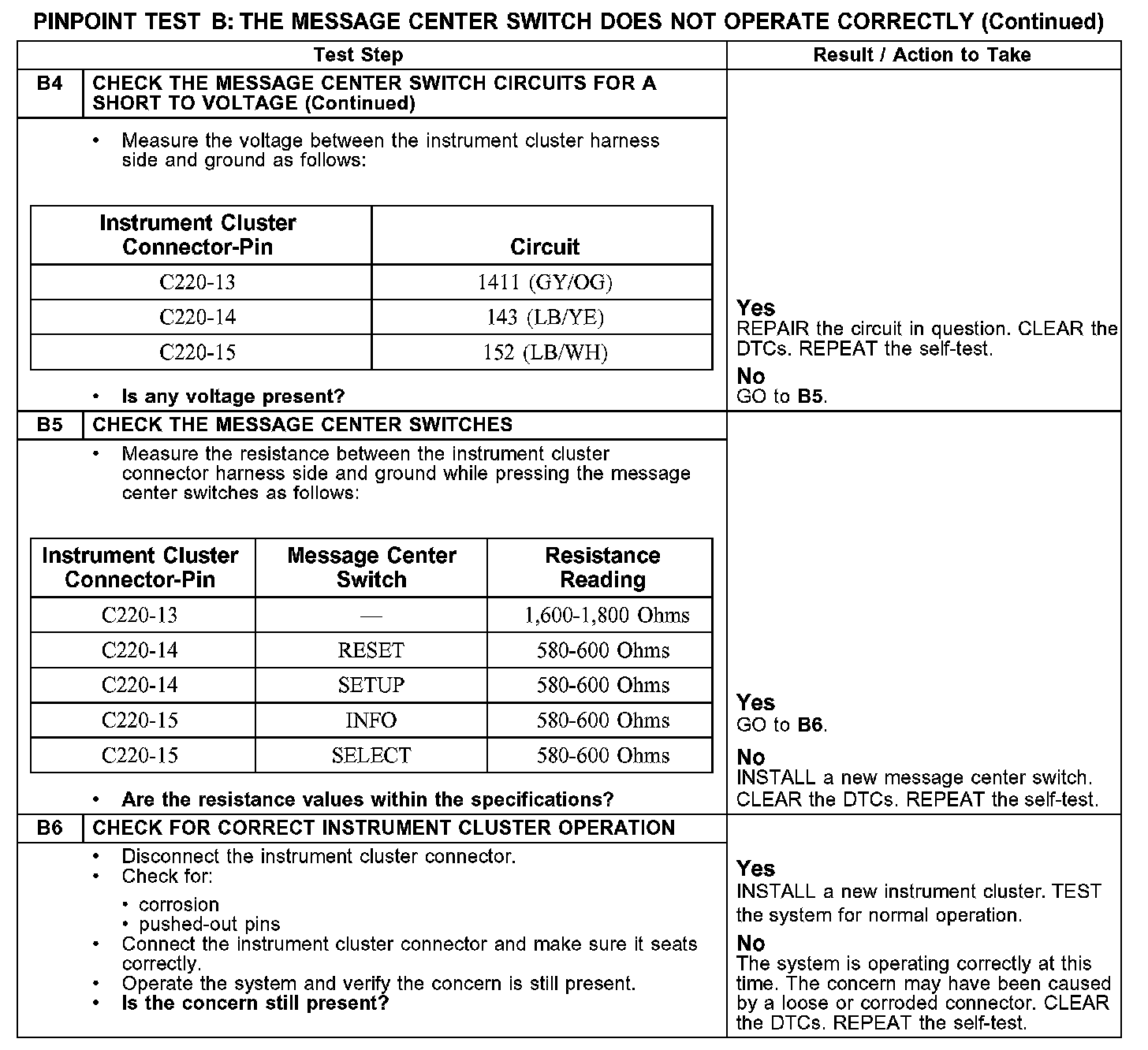 The message center functionality is controlled through the message center switches, which are hardwired to the instrument cluster. The instrument cluster monitors the message center switch input by sending reference signals through circuits 143 (LB/YE) and 152 (LB/WH). The message center switch return signal is routed back to the instrument cluster through circuit 1411 (GY/OG).