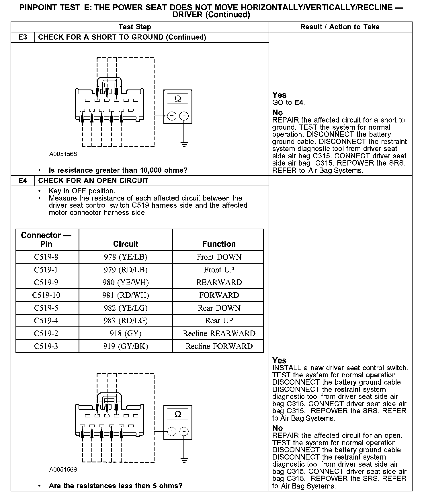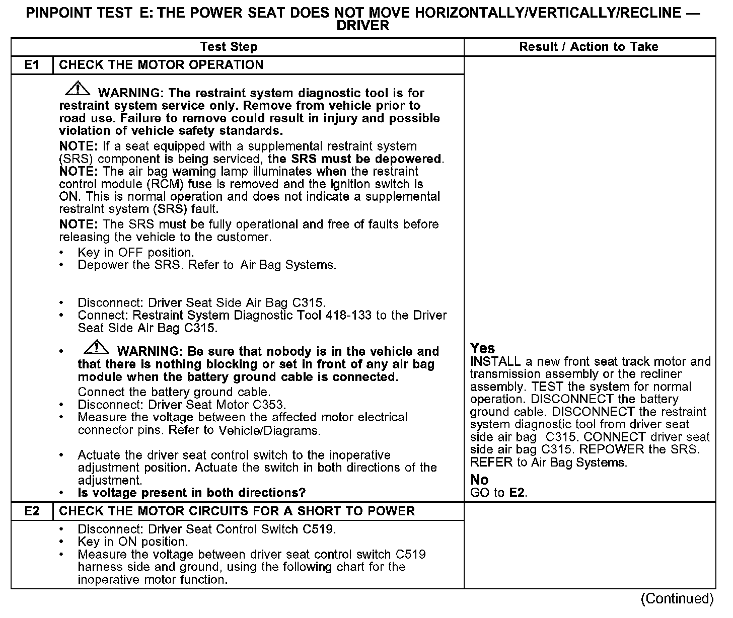 PINPOINT TEST E: THE POWER SEAT DOES NOT MOVE HORIZONTALLY/VERTICALLY/RECLINE - DRIVERE1-E2: