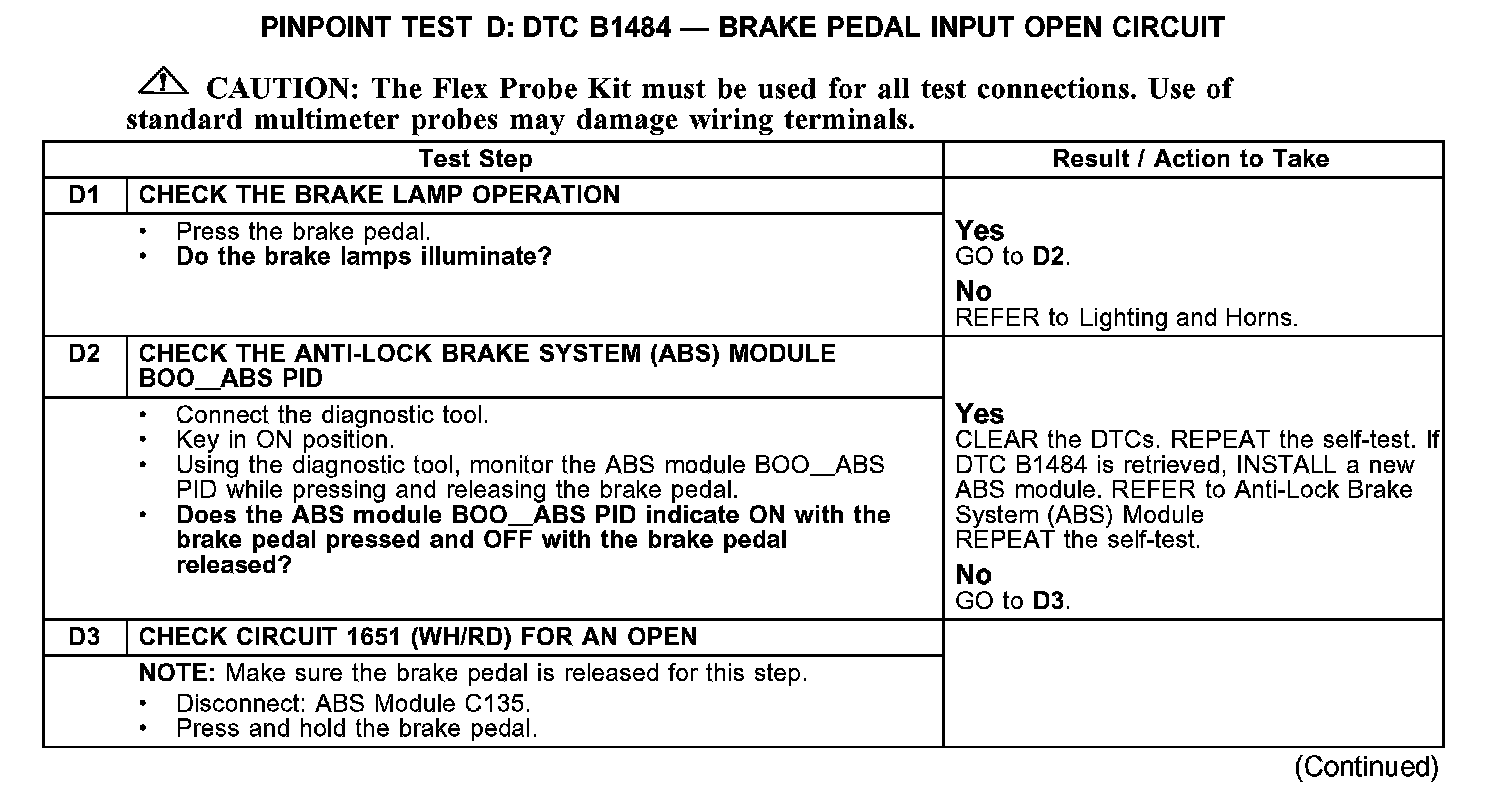 Test D: DTC B1484 - Brake Pedal Input Open Circuit