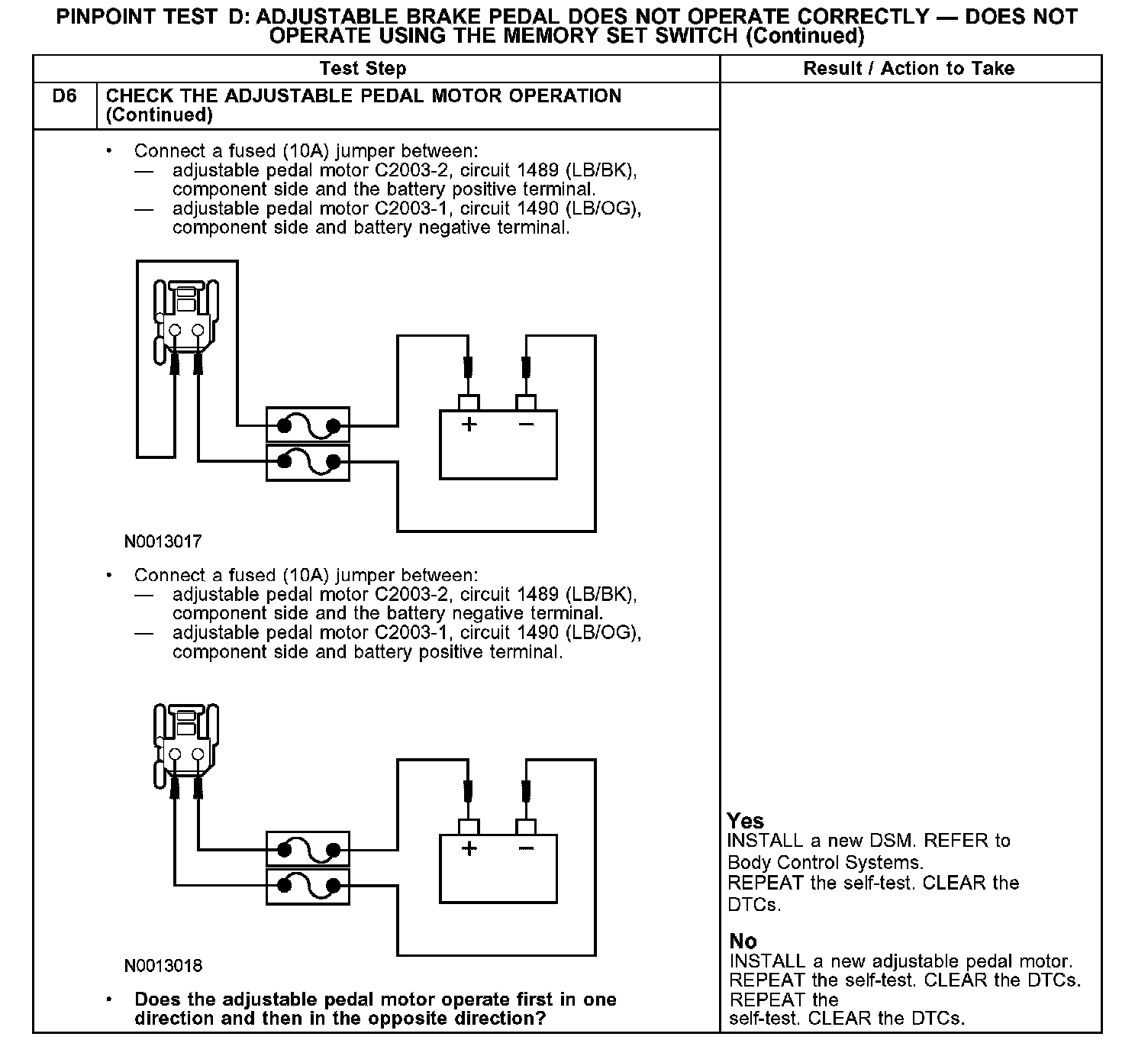 When the memory switch is pressed, the driver door module sends a message to the driver seat module along the CAN bus indicating that a memory request has been made. The DSM sends voltage to the adjustable pedal motor along circuits 1489 (LB/BK) and 1490 (LB/OG) depending on the memory request message.