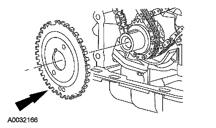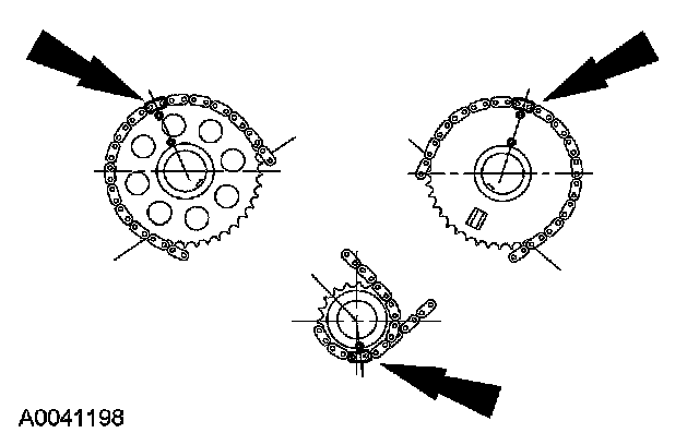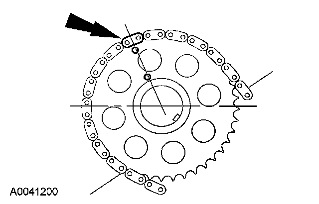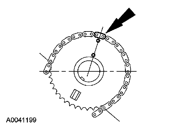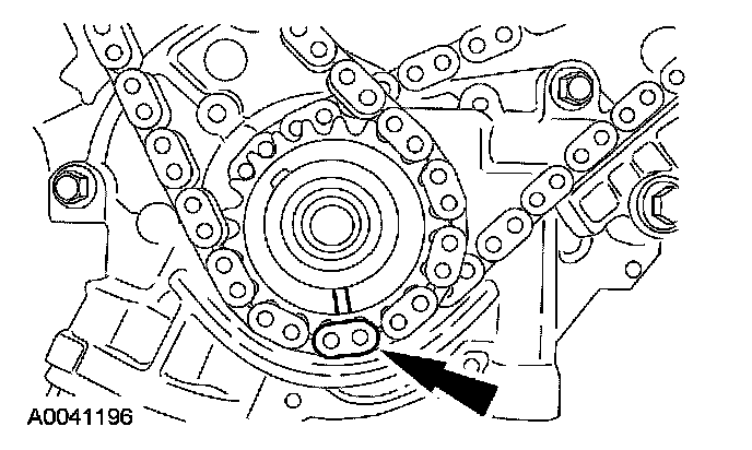 21. Position the LH (inner) timing chain on the crankshaft sprocket, aligning the copper (marked) link with the timing mark on the sprocket.