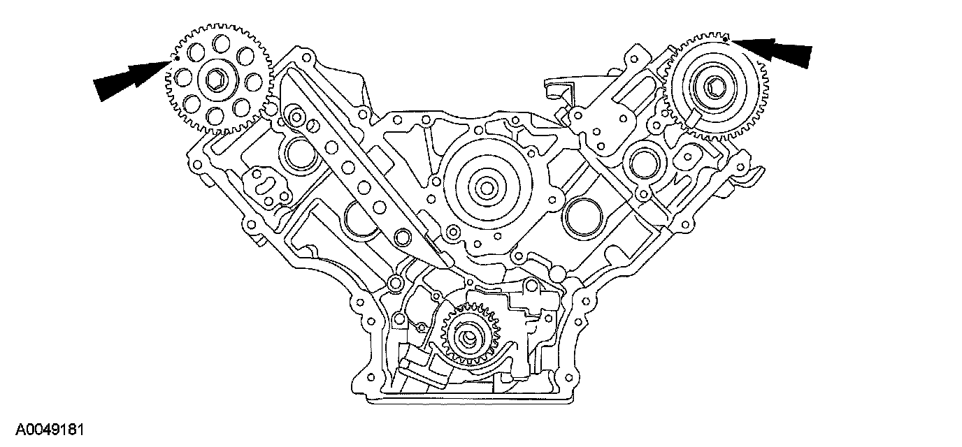 37. Rotate the RH camshaft sprocket until the timing mark is approximately at the 11 o'clock position. Rotate the LH camshaft sprocket until the timing mark is approximately at the 12 o'clock position.