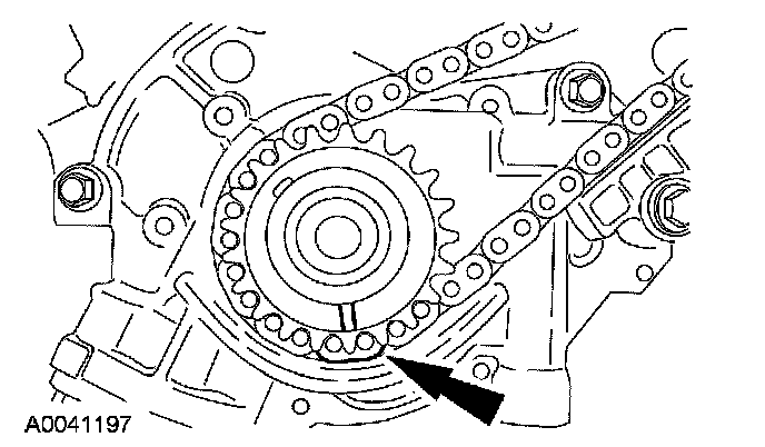 38. Position the LH (inner) timing chain on the crankshaft sprocket, aligning the copper (marked) link with the timing mark on the sprocket.